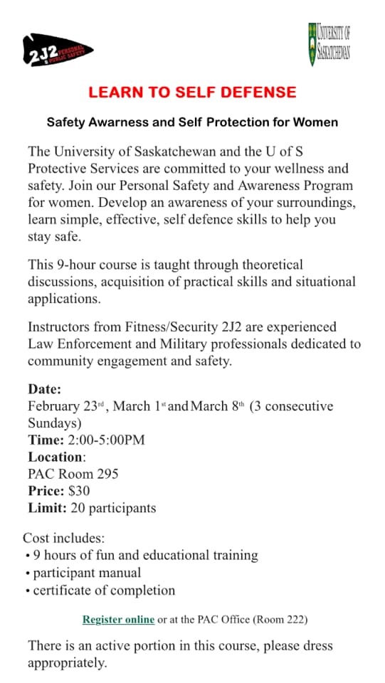 February 10, 2020 By F2J2 admin Join us at the University of Saskatchewan during term 2. Three Sundays, Three hours, beginner Aikido-Jiujitsu style self defence training. You can join in for one or all three sessions, registration through the PAC.